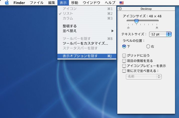 例えば、何か一つフォルダを選んでから次のようにすると、 その、フォルダの表示を変えることが出来る